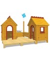 Costruito interamente in legno di pino svedese lamellare e/o massello, impregnato a pressione con sali di rame, e ulteriormente trattato con vernici pigmentate a base acrilica, al fine di proteggere il legno anche dalle degradazioni chimico-fisiche esercitate dai raggi ultravioletti (azione fotolitica sulla lignina, causa principale dell'ingrigimento del legno esposto alle intemperie).- Casette costruite con tavole spigolate e parzialmente sovrapposte di sez. mm. 143x20 e montanti di sez. mm. 72x72; complete di tetto a due falde con cornice sagomata in legno massello al colmo e pedana di calpestio da cm. 102x102 realizzata con tavole di sez. mm. 145x20 e traversi di sez. mm. 95x35. Dotate di 1 apertura di ingresso con cornice in legno massello di sez. mm. 40x55; 2 aperture per finestre con davanzalino e cornice di sez. mm. 40x55; 1 apertura banco vendita. All'interno elemento ludico "fornelli" in MEG sagomato al pantografo e 2 sedute in multistrato verniciato da mm. 21 di spessore.Dimensioni singole casette: cm. 120x120x189h- Fioriera costruita con tavole di sez. mm.115x45 (dimensioni cm. 113x50x60h)- Recinzione costruita con tavole verticali di sez. mm. 140x20x400h stondate sulla parte superiore e traversi di sez. mm.95x35.- Pedane esterne di calpestio da cm. 102x102 realizzate con tavole di sez. mm. 145x20 e traversi di supporto di sez. mm. 95x35.- Palo con girandola di sez. mm.72x72x1800h e girandola di colorata in policarbonato trasparente, fissata tramite un perno centrale ad una rotella in nylon avvitata sulla cima filettata di un' asta di supporto in acciaio inox, il tutto fissato sulla cima del montanteSICUREZZA: COSTRUITO RISPETTANDO LE NORME EN 1176